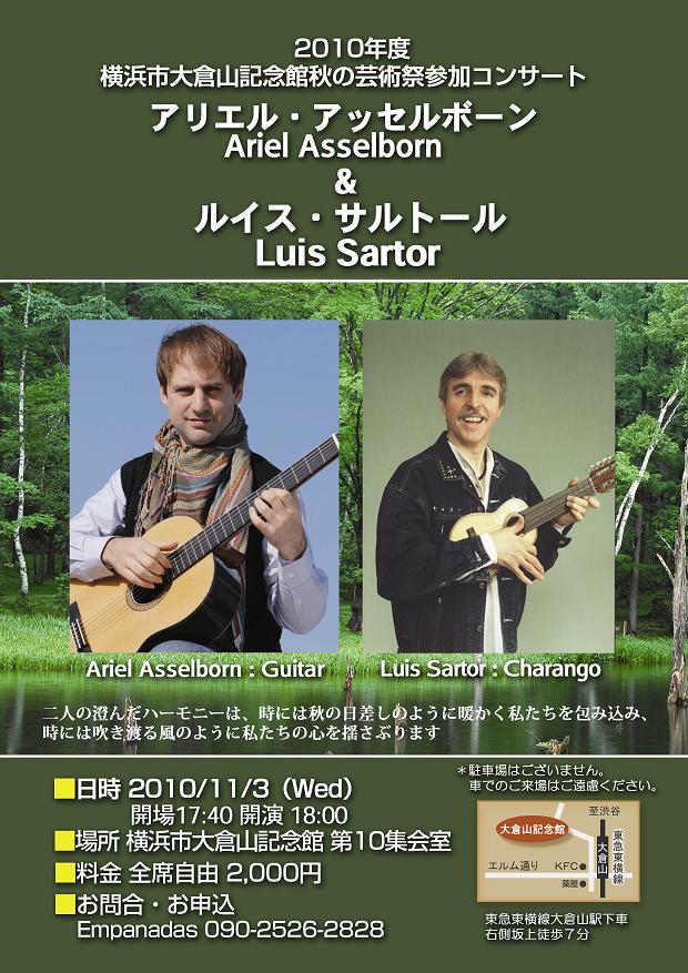 Los dos músicos argentinos más reconocidos de Japón, el charanguista Luis Sartor, perteneciente al conjunto Los Tres Amigos, y el guitarrista Ariel Asselborn, presentarán juntos nuevas canciones folclóricas de su tierra natal, temas que serán incluidos en su nuevo álbum del próximo año. Sartor y Asselborn tocarán en la 26 edición del festival de arte de Okurayama, en Yokohama, que se realiza en el complejo Okurayama Kinenkan y tiene una historia de más de 70 años.