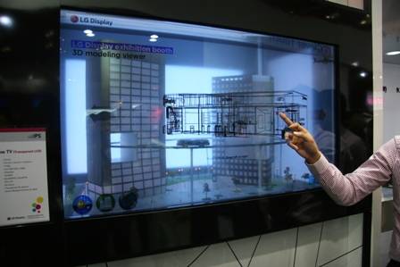 El otro gigante surcoreano, LG Display. también ha mostrado un sorprendente prototipo de una pantalla diáfana de 47 pulgadas. El «47 Window TV» es un visualizador táctil con alta resolución Full HD (1920 x 1080) que permite manejar la pantalla con los dedos tanto para navegar por mapas como escribir en un teclado que aparece sobre la pantalla.