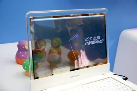 La pantalla se llama AMOLED, por siglas en inglés de Active Matrics Organic Light Emitting Diode, que es lo nuevo de Samsung que utiliza diodos emisores de luz orgánica (OLED). Detrás de la pantalla de la laptop se ve todo mientras el visualizador reproduce imágenes.