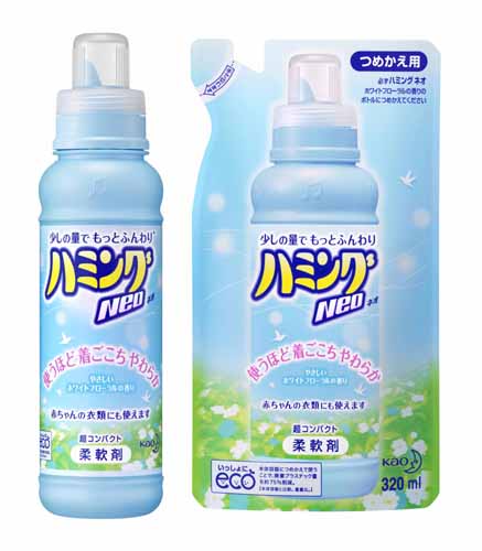“Humming Neo” (ハミングネオ), de Kao, ha sido desarrollado para las lavadoras que gastan menos agua porque los suavizantes corrientes no funcionan bien en ellas. Se trata de un producto más espeso que los suavizantes anteriores, y cuenta con nuevas sustancias que ayudan a suavizar, de ahí que se sienta más delicada la piel cuanto más se usa. Tiene un suave aroma a flores. También se puede usar para las prendas de bebé. Lanzamiento: 20 de noviembre del 2010. Precio: aprox. 300 yenes (400 ml), 240 yenes (recambio de 320 ml).