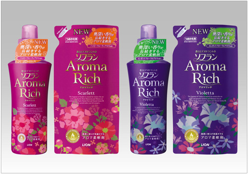 El nuevo suavizante líquido de Lion se llama “Kaori to Deodorant no Sofuran Aroma Rich” (香りとデオドラントのソフラン アロマリッチ) y contiene aceites esenciales naturales y aromatizantes que hacen que su función dure más tiempo. Hay dos variedades con sendos aromas: “Scarlett”, de flores, y “Violetta”, de violetas. Con sustancias naturales suavizantes, previene la electricidad estática y elimina el mal olor del sudor y el tabaco. También tiene efecto antibacteriano. Lanzamiento: 6 de octubre del 2010. Precio: 398 yenes (620 ml), 298 yenes (recambio de 480 ml).