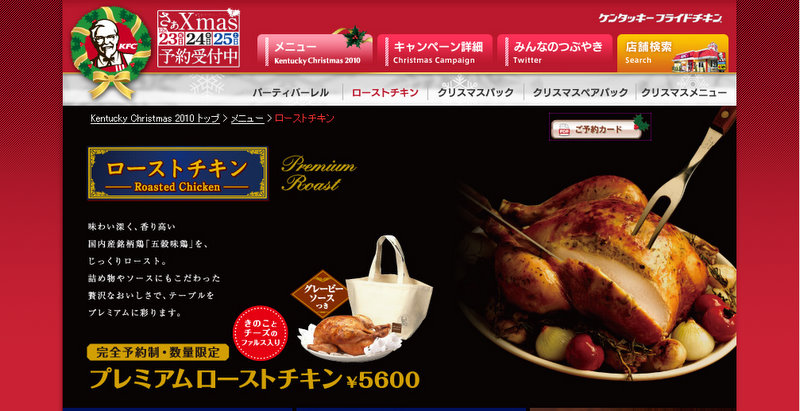 Para esta Navidad 2010, Kentucky ofrece en Japón un pollo entero (roast chicken) a 5.600 yenes, un seto navideño de 3.880 yenes que trae 8 piezas de pollo frito, ensalada, torta de chocolate y un platito con motivos navideños de regalo, entre otras ofertas para estas fiestas. (International Press)