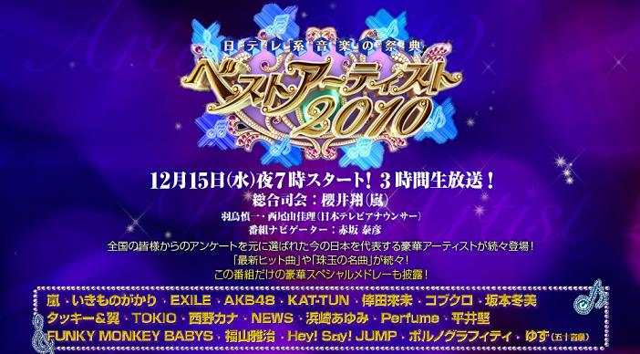 Uno de los eventos de música popular japonesa más importantes de fin de año, el “Best Artist 2010” de Nippon TV, se celebró el miércoles 15 en Makuhari Messe, en la provincia de Chiba, y se transmitió en vivo desde las 19.00 hasta las 22.00 horas con la participación de 20 grupos y cantantes elegidos por la audiencia del canal.