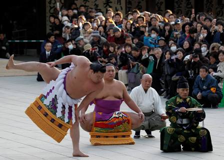 Hakuho, el yokozuna, Gran Campeón del sumo nacido en Mongolia, realiza el rito de entrada al ring en la celebración de bienvenida del Año Nuevo en la ceremonia realizada ayer en el tempo de Meiji en Tokio. (Reuters)