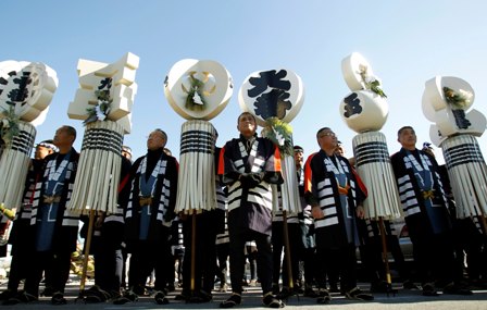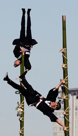 Los miembros de la Asociación de Conservación de los Bomberos de Edo muestran sus habilidades de equilibrio encima de las escaleras de bambú durante una manifestación de bienvenida del Año Nuevo a cargo de la Brigada de Bomberos de Tokio. En la actividad, que se realiza cada año, los participantes lucen atuendos tradicionales y muestran los estandartes de los antiguos bomberos de Japón. (Reuters)