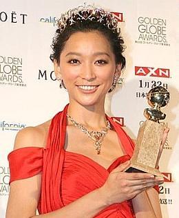 La actriz, que usó una diadema valorizada en 850 mil dólares, habló de los triunfadores de la gala, como «La Red Social», actualmente en cartelera en Japón. Lamentablemente, “Origen”, la película en la que actuó su padre, no ganó nada.
