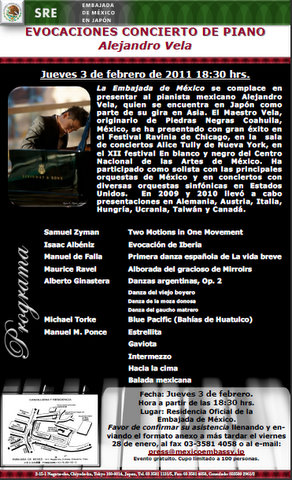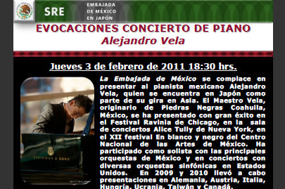 La en Japón presentará el jueves 3 de febrero un concierto del pianista mexicano Alejandro Vela, quien se encuentra en el país del Sol Naciente para realizar una presentación como parte de su gira por Asia.