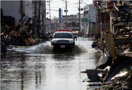 La gran masa de agua que siguió al terremoto de 9 grados Richter invadió la ciudad y borró del mapa urbano el área del puerto, que aparece todavía como una sucesión de escombros, edificios destrozados y vehículos volcados.