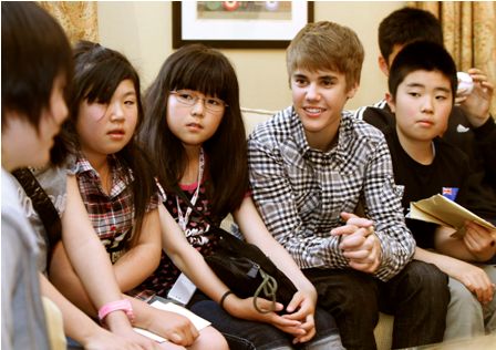 El astro canadiense Justin Bieber se reunió con un grupo niños japoneses damnificados por el desastre del 11 de marzo.
