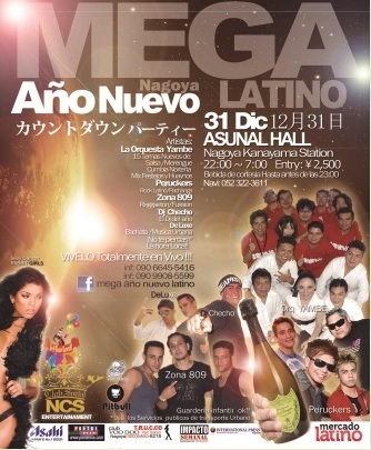 El Asunal Hall, en Nagoya, será sede de una fiesta latina para recibir el nuevo año. Animarán el show: la Orquesta International YAMBE, la banda de rock latino Peruckers, los reguetoneros dominicanos de Zona 809, el dúo DeLuxe (bachata y reggaetón), las bailarinas Rabbit Girls y el DJ Checho (salsa, merengue, bachata, cumbia, reggaeton, hip hop).