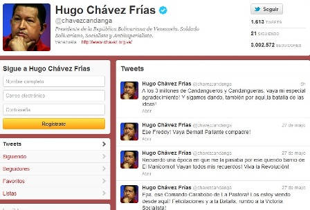 La cuenta @chavezcandanga, dirección en la red social Twitter de Hugo Chávez, llegó hoy a los tres millones de seguidores, poco más de dos años después de crearse y convertida en el medio con el que el presidente de Venezuela ha hecho anuncios, celebrado, dado pésames e informado sobre su enfermedad.