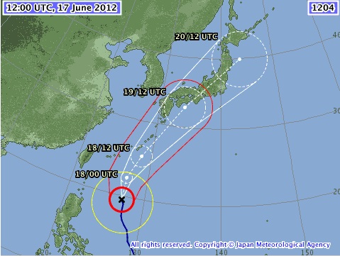 Se trata del tifón Nº4, que según la dirección trazada por la Agencia, pasaría por el medio de la isla principal de Japón entre el martes 19 y el miércoles 20 de junio con relativa fuerza.