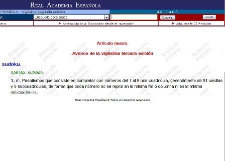 El simpático «canalillo», es decir, el «comienzo de la concavidad que separa los pechos de la mujer tal como se muestra desde el escote», y el entretenido pasatiempo del sudoku, figuran igualmente entre los avances de la 23ª edición del diccionario, que se publicará en otoño de 2014 como cierre de la celebración del tercer centenario de la RAE, que comienza en 2013.