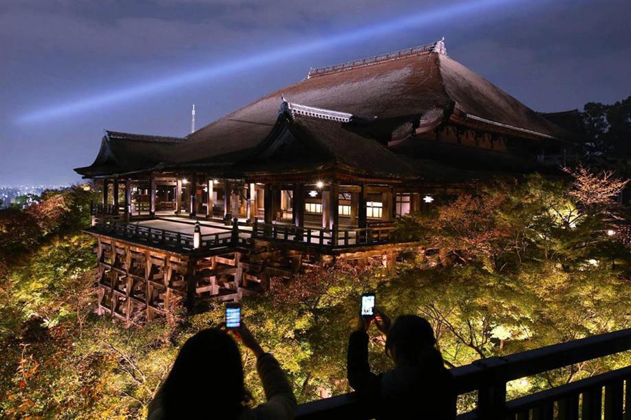 Cerca de 500 reflectores iluminan los árboles alrededor del templo Kiyomizudera (Kioto) que se pintan de amarillo y rojo en esta época del año. La iluminación de otoño va hasta el 2 de diciembre.