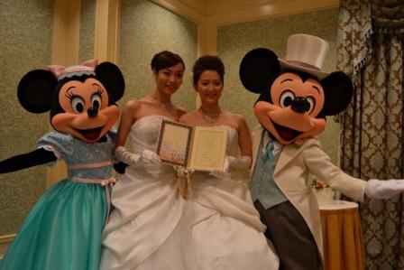 Las dos mujeres llevaban vestidos de novia. Higashi posteó fotos del evento en su cuenta de Twitter. La pareja, sonriente, aparece flanqueada por Mickey Mouse y Minnie.