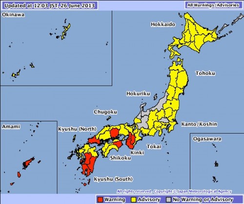 La alerta roja, con previsión de inundaciones y deslizamientos en zonas montañosas, fue emitida para las regiones de Kinki, sur y parte norte de Kyushu y algunas zonas de Chugoku.