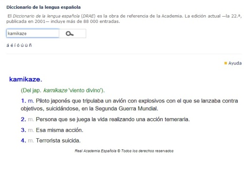 Así pues, aclara la Fundéu BBVA, que trabaja asesorada por la Real Academia Española, «kamikaze» se considera en la actualidad una palabra española, por lo que en los ejemplos anteriores lo apropiado habría sido escribirla sin comillas.