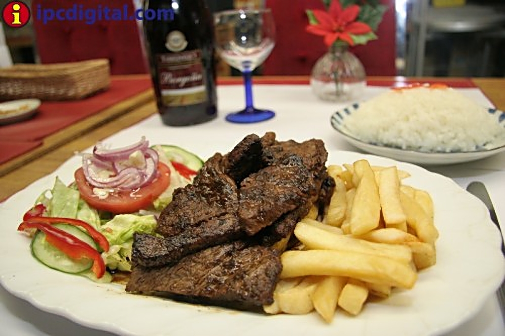 Por eso la sazón es la de un anticucho tradicional con ají panca, ajo, vinagre, ají amarillo molido, orégano, además de sal y pimienta. Le hecha fuego a la carne y se sirve con papas fritas, y una ensalada con lechuga, tomate, salsa vinagreta y una hojitas de cebolla deshidratada. Viene acompañado de arroz y todo por ¥1.500.