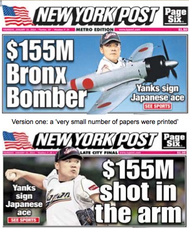 New York Post compuso una imagen en la que aparecía el japonés Masahiro Tanaka, flamante fichaje del equipo de béisbol New York Yankees, al mando de un caza parecido al que empleó Japón para atacar Pearl Harbor el 7 de diciembre de 1941.