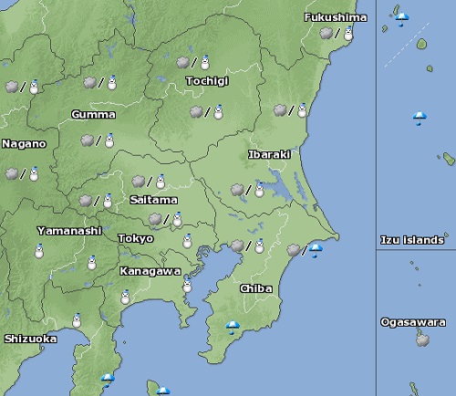 En las ciudades de Kanto la nieve empezaría al promediar las 9 de la mañana. Se espera que desde el mediodía la precipitación se convierta en agua-nieve (mizore en idioma japonés) durante casi todo el día. Habrán vientos fuertes en toda la zona costera.