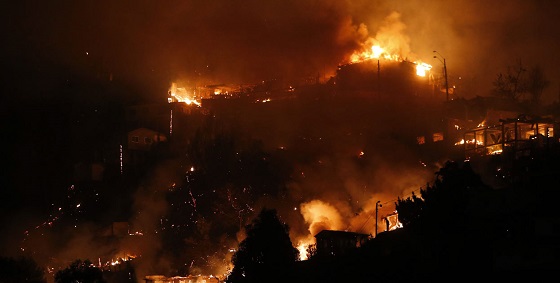 En apenas doce horas, cinco cerros de la zona urbana de la ciudad chilena de Valparaíso quedaron calcinados por un incendio que ha provocado la muerte de al menos 12 personas, destruido 2.000 casas y obligado a evacuar a más de 10.000 vecinos, señalaron hoy fuentes oficiales.