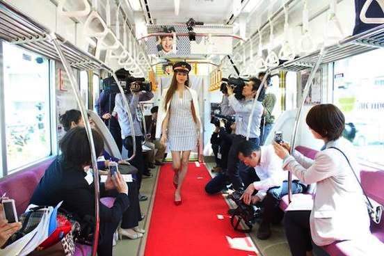 Quince modelos, entre mujeres y hombres, luciendo novedosos atuendos de marca, desfilaron el lunes 14 por la alfombra roja extendida en el interior de 3 vagones del tren de Inogashira, en Tokio. El espectáculo de alta costura en el cual participó la destacada modelo japonesa Karen Michibata, tuvo como objetivo anunciar la apertura, el próximo miércoles 23, de un gran almacén (depaato) en la estación de Kichijoji.