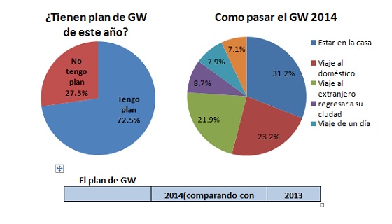 En este GW el promedio de días que los trabajadores en Japón pueden descansar es de 5,4: 4 días (55.8%), 5 días (9.0%), 6 días (5.9%). La encuesta revela también que las personas que tienen más días de vacaciones (7,5 días) planifican viajar al extranjero (21,9%), los que tienen 5,7 días de descanso piensan viajar dentro del país (23,2%) mientras que aquellos que tendrán 4,8 días libres planean visitar su ciudad natal (8,7%). Sin embargo, la gran mayoría se quedará en casa (31,2%) porque tendrán solo 4,4 días de vacaciones.