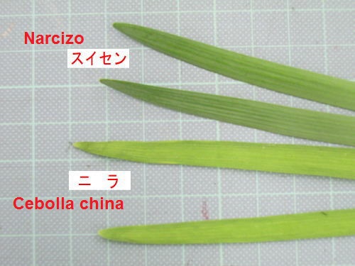Una joven pareja japonesa sufrió una intoxicación alimentaria por comer las hojas del narciso (スイセン), informó ayer el municipio de la provincia de Hyogo. Ellos, según dijeron, confundieron el narciso con la cebollita china (ニラ). Ambos se quejaron de náuseas, y como los síntomas fueron leves mejoraron.