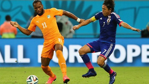 Costa de Marfil pasaba penurias ante un rival que se movía con propiedad por un terreno liso por la lluvia hasta cuando Didier Drogba salió del banco a los 62 minutos y desarmó con su presencia una cerrada defensa que administraba sin mayores preocupaciones la magra renta que había sacado Keisuke Honda a los 15 minutos.
