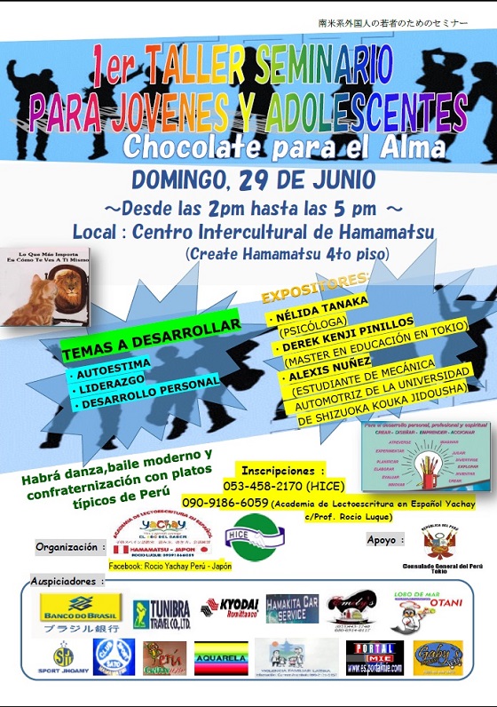 Abiertas las inscripciones para participar en el 1re Taller Seminario para Jóvenes y adolescentes «Chocolate para el alma» que se realizará el domingo 29 de junio en el Centro Intercultural de Hamamatsu (Create Hamamatsu 4to piso).
