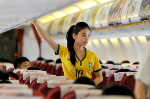 Una línea aérea china, Lucky Air, ha decidido ponerse a tono con el clima que el mundo futbolero vive y vestir a sus azafatas con la camiseta de Brasil, además de decorar sus aviones con imágenes del Mundial.