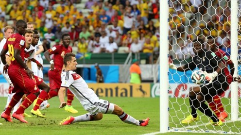 Mario Goetze en el minuto 52 adelantó a los alemanes, pero Andre Ayew (m.54) y Gyan (m.63) remontaron, hasta que Klose, de 36 años, entró a los 69 minutos para apagar el incendio y a los 71 empató en un córner.