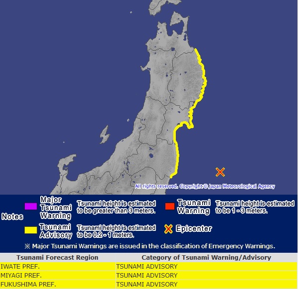 Según la Agencia Meteorológica de Japón, a las 5 y 19 de esta mañana llegó un tsunami de 20 cm. a las playas de Ishinomaki, en la provincia de Miyagi.