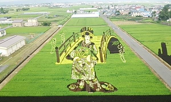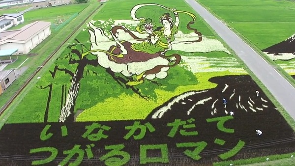 El arrozal mide 140 metros de largo y 100 metros de ancho. Allí se ha sembrado 10 tipos de plantas de arroz de varios colores para representar a la diosa vestida con una túnica de plumas mientras flota sobre una nube teniendo a su lado al monte Fuji y unos árboles de pino a sus pies.