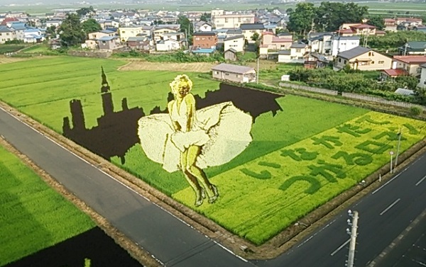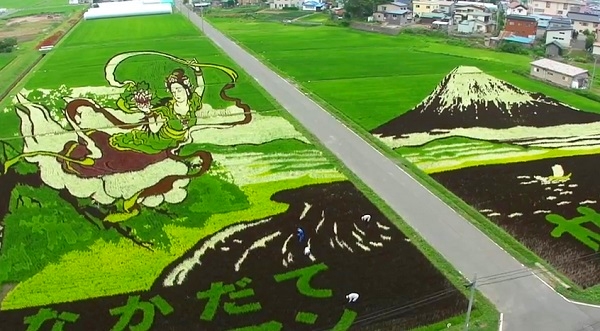 Las originales obras de arte creadas en extensos arrozales podrán admirarse hasta el 13 de octubre próximo.(International Press)