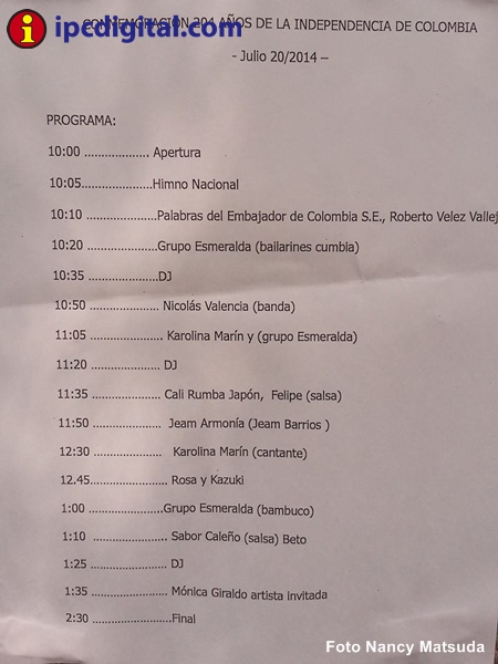 La conmemoración fue encabezada por el nuevo embajador colombiano, Roberto Vélez Vallejo.Cientos de personas se reunieron en el corazón de Tokio el domingo 20 de julio para Conmemorar los 204 años de la Independencia de Colombia. El Parque Hibiya se convirtió nuevamente en el escenario de la Fiesta Colombiana, llena de colorido, buena música, ritmo y sabor.