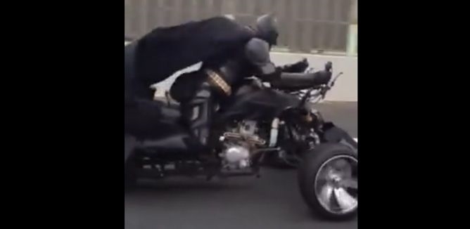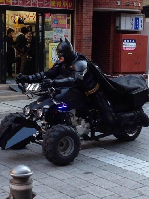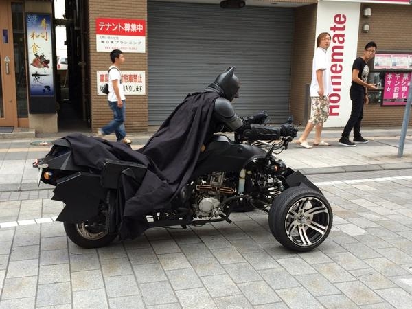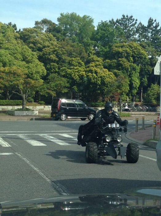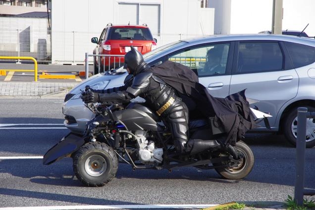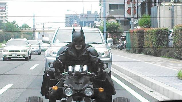 La motocicleta que utiliza, y que imita al Batpod de dos ruedas de la película, es en realidad un triciclo arenero que, según las leyes japonesas, está en el rango de carro por lo que el conductor no está en la obligación de usar casco.