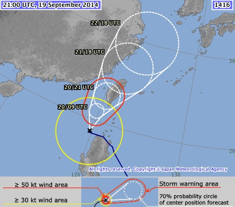 Según la observación de la Agencia, el taifu número 16 está avanzando con una velocidad de 25km/hora. El promedio de velocidad máxima de viento alrededor del centro del tifón es de 23m/sg., y la velocidad máxima del viento es de 35m/sg. Dentro del radio de 390km. el viento es de 15m/sg., informó la cadena japonesa de televisión NHK. (ipcdigital)