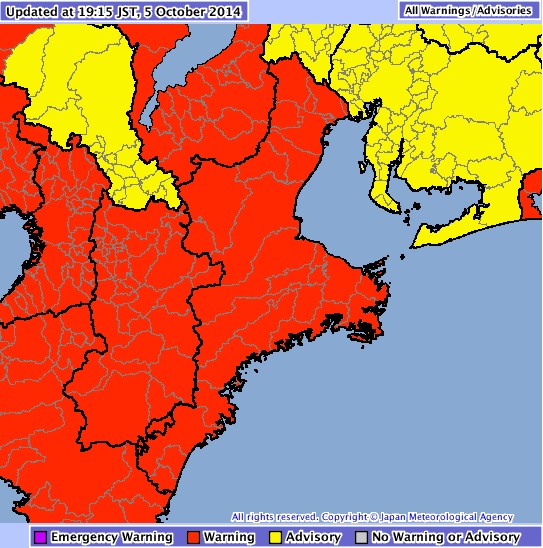 A esta hora toda la provincia de Mie se encuentra bajo advertencia de fuerte tormenta a la espera de que el centro del tifón pase frente a sus costas a partir de las 21 horas de hoy aproximadamente. El ojo del tifón se encuentra a esta hora frente a la región de Kyushu, según datos satelitales de la Agencia Meteorológica de Japón. (ipcdigital)
