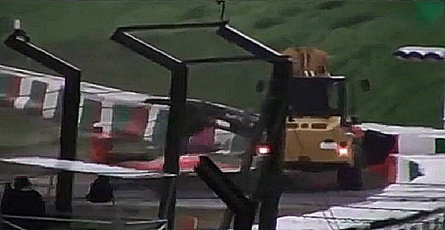 «Oh my god», oh Dios mío», se escucha decir al camarógrafo ocasional cuando el coche de Bianchi se estrelló. El impacto fue tan violento que el coche de Bianchi levanta la parte trasera de la pesada grúa. La imagen muestra a un operario que está tras la grúa y que aparentemente es golpeado.
