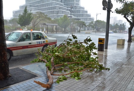El diario Mainichi informa que en las calles de Naha se pueden ver árboles partidos en las calles y que se soporta una lluvia intensa.