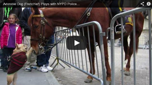 La imagen es viral en la red. Ocurrió en las calles de Wall Street en Nueva York donde un pequeño bulldog francés salta y juguetea frente a un caballo de la policía estadounidense. El caballo ofrece muy cariñosamente su ocico al perrito.