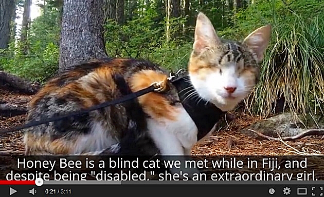 La gata Honey Bee es ciega y ama el montañismo. Perdió los ojos, pero no el olfato y el tacto para percibir los aromas y formas de la naturaleza de una manera que cautiva a quien la ve.