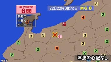 El terremoto alcanzó una intensidad de 6 inferior en la escala japonesa cerrada de 7 grados (centrada en las zonas afectadas más que en la intensidad del temblor) en la ciudad de Nagano y en las localidades de Otari y Ogawa, mientras que Hakuba registró una intensidad de 5 superior.