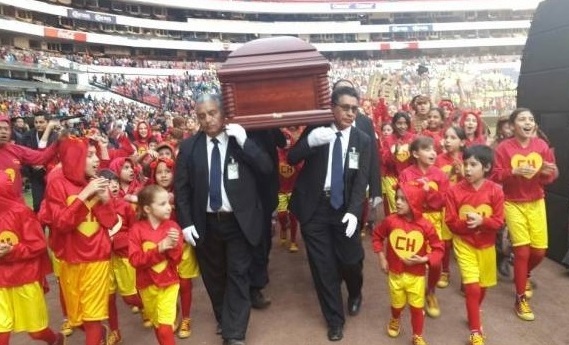 Al ataúd fue colocado en una enorme carpa en la cancha ante una cruz y dos grandes fotografías del actor. Su viuda, la también actriz Florinda Meza, se aproximó para depositar flores junto al féretro, no sin antes elevarlas en señal de agradecimiento al público.