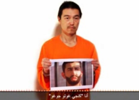 El audio, publicado en Youtube y de un minuto y 50 segundos de duración, aparece acompañado de una fotografía de Goto, vestido con un mono naranja y sosteniendo en sus manos una instantánea de Kasasbeh, con la barba pintada.