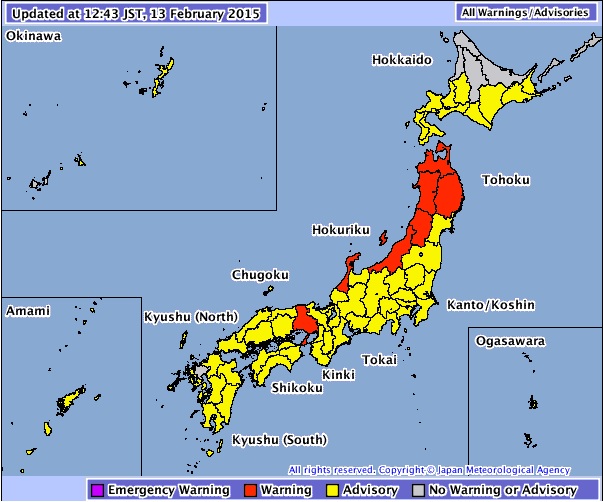 La agencia emitió alerta roja para Aomori, Iwate, Akita, Yamagata, Niigata e Ishikawa que a esta hora soportan una tormenta de nieve acompañada de poderosos vientos desde el oeste y olas en el mar de hasta 2.5 metros.