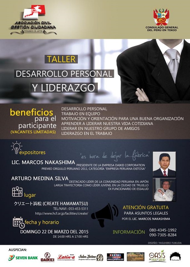La Asociación Civil Gestión Ciudadana “Peruanos en Japón” y el Consulado General del Perú en Tokio anunciaron el “Taller de Desarrollo Personal y Liderazgo” que se realizará el próximo domingo 22 de marzo desde las 14.00 horas en el edificio Create en Hamamatsu, Shizuoka.