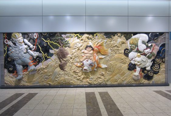 El mural, realizado en cerámica y que lleva por título «Kinka Doji montando las olas acompañado de Fujin y Raijin», mide 2,8 metros de alto por 8,7 metros de ancho y se exhibe desde el jueves en el vestíbulo principal del aeropuerto nipón, informó a Efe un portavoz del proyecto.