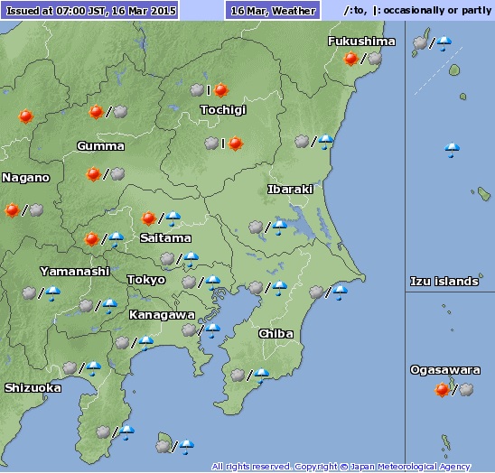 2015//03/16 Lunes con lluvia en Tokio desde la tarde y aumento de temperatura en todo Japón